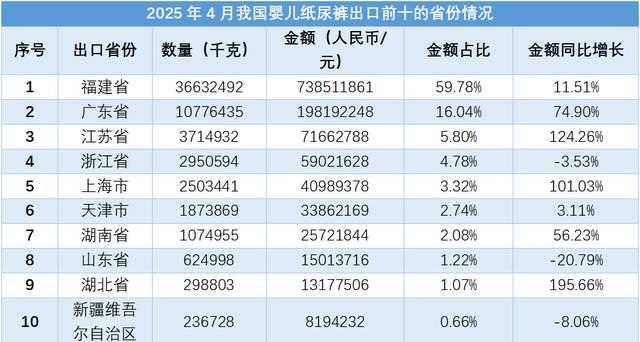 從出口省份來看,2025年4月我國嬰兒紙尿褲出口金額前5的省份分別為福建省、廣東省、江蘇省、浙江省和上海市。